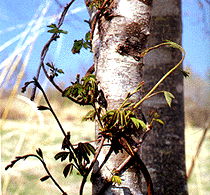 - 特徴・雑木に巻きつき高く伸びるつる性の落葉樹、葉は掌状で長い柄がある。春には淡紫色(ミツバアケビは暗紫色)の花をつける。秋には長球状の実がなり、熟すと縦に割れ、おいしい実を提供してくれる。