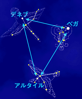 夏の大三角ってなーに? 夏の大三角形は、こと座のべガ、わし座のアルタイル、はくちょう座のデネブの3っの星を線で結んでできる、細長い大きな三角形のことです。夏の夜空に目立って見えるのでこの名前がつきました。3っとも1等星で、よく見えます。夏の星座入門も、案内役と言ってよいでしょう。 このうち、ベガは七夕のおりひめ星(織女星)、アルタイルはひこ星(牽牛星)にあたります。天の川を挟んできれいに輝いています。 |